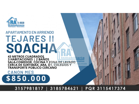APARTAMENTO EN ARRIENDO DE 3 HABITACIONES EN TEJARES II D4832 Apartamento en arriendo – 43 m² Vista exterior (2° piso, acceso por escaleras) 3 habitaciones | 2 baños Sala-comedor, cocina y zona de lavado Parqueadero comunal Conjunto con zonas verdes, parque infantil y salón social Vigilancia privada 24/7 Cerca de Surtimáx, Ara, D1, colegios y transporte público Canon $850.000