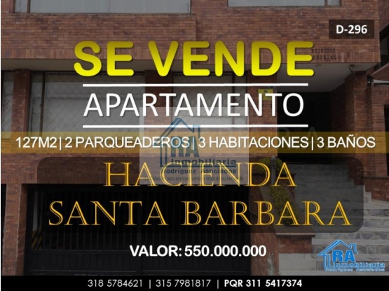 SE VENDE GRAN APARTAMENTO CON 2 PARQUEADEROS EN BARRIO HACIENDA SANTA BARBARA D-296 Se vende apartamento con doble parqueadero y excelente iluminación ubicado en barrio hacienda santa bárbara con un área de 127 metros cuadrados que consta de 2 alcobas amplias con closet de pared a pared, una de ellas con baño privado, 1 cuarto de servicio con baño, sala comedor amplia, cocina integral, 1 baño social 2 parqueaderos, zona de lavado independiente, patio de ropas y terraza independiente El apartamento se encuentra excelente mente ubicado a media cuadra de la av. carrera 30 con autopista norte, Clínica los nogales, parque urbano el virrey Valor: 550.000.000 INMOBILIARIA R.A “Nacimos para servir” Contáctanos vía WhatsApp: http://wa.me/573185784621 http://wa.me/573157981817 Conoce nuestros inmuebles: WEB PAGE: http://inmobiliariara.domusweb.co/ INSTAGRAM: http://instagram.com/_inmobiliariara FACEBOOK: http://facebook.com/InmobiliariaRA TWITTER: http://Twitter.com/_inmobiliariaRA YOUTUBE: https://www.youtube.com/channel/UCAUtWv-Ud9NYe7ZemMMeXAQ?view_as=subscriber UBÍCANOS: https://g.page/INMOBILIARIARA NUESTRA EMPRESA: http://INMOBILIARIARA.NEGOCIO.SITE INMOBILIARIA R.A “nacimos para servir” CONTÁCTENOS... http://inmobiliariara.domusweb.co Celular: +57 3185784621-3157981817 PQR 3115417374 Teléfono: +57 (1) 5649646 mail: inmobiliariariarodriguez.a@gmail.com Dirección: Carrera 71 D # 2 B - 13 Bogotá (Colombia)