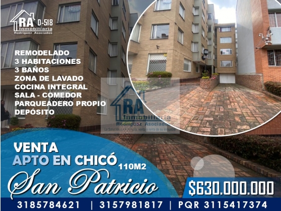 SE VENDE APARTAMENTO DE 110M2, 3 HABITACIONES, CON PARQUEADERO Y DEPOSITO EN CHICO SAN PATRICIO D-518 Se vende espectacular apartamento remodelado con excelentes acabados, ubicado en chico san patricio con área de 110 mt2, parqueadero propio, habitación principal amplia con baño privado, tina, walk in closet, otra habitación amplia con closet y baño privado, otra habitación amplia, baño social, sala comedor amplia, cocina abierta tipo americana integral, zona de lavado privada, 1 parqueadero propio, 1 deposito propio, el apto está ubicado en un segundo piso sin ascensor. El apto queda a 4 cuadras de la autopista norte, de la estación de la calle 106, cerca de sector bancario, super mercados y todo tipo de comercio. Valor: 630.000.000 INMOBILIARIA R.A “Nacimos para servir” Contáctanos vía WhatsApp: http://wa.me/573185784621 http://wa.me/573157981817 Conoce nuestros inmuebles: WEB PAGE: http://inmobiliariara.domusweb.co/ INSTAGRAM: http://instagram.com/_inmobiliariara