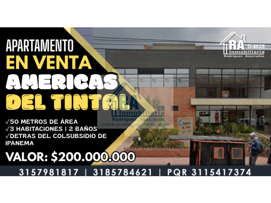 APARTAMENTO EN VENTA EN AMÉRICAS DEL TINTAL D-4828 Apartamento en venta con excelente ubicación Apartamento de 50 m² con vista externa, ubicado en el reconocido Conjunto Américas del Tintal, una zona residencial de alta demanda gracias a su tranquilidad, excelente ubicación y constante valorización. El inmueble cuenta con una distribución funcional y acogedora. Dispone de sala-comedor, tres habitaciones, dos de ellas con clóset. La habitación principal incluye baño privado, además de un baño social, ofreciendo comodidad y privacidad para toda la familia. La cocina integral se integra de manera armónica con la zona de lavado independiente, optimizando el espacio y mejorando la funcionalidad del hogar. Gracias a su excelente iluminación natural, el apartamento se mantiene fresco y agradable durante todo el día, creando un ambiente cálido y confortable. Zonas comunes del conjunto: Parqueadero comunal para carros y motos Parqueadero para bicicletas Jardín infantil Salones comunales Parque infantil Ubicado detrás del Colsubsidio de Ipanema, con fácil acceso a transporte público y cercanía a instituciones educativas, supermercados, comercio y servicios. Una opción ideal tanto para vivienda familiar como para inversión. Valor: $200.000.000