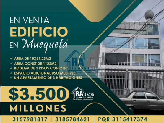 EDIFICIO EN VENTA CON AMPLIA RENTABILIDAD UBICADO EN MUEQUETA, BARRIOS UNIDOS D-4765 Edificio ubicado en la carrera 22 n° 63 c-54 con área lote de 10 metros de frente por 31, 23 metros de fondo con área construida de 1122 m ² con bodega de dos pisos con oficina, cocineta 4 baños, mezannine y deposito. En el tercer piso espacio disponible para bodega u oficinas y 2 baños privados; en el cuanto piso apartamento con sala comedor, cocina, baño social tres habitaciones la principal con baño. Valor: $ 3`500.000.000 INMOBILIARIA R.A “Nacimos para servir” Contáctanos vía WhatsApp: http://wa.me/573185784621 http://wa.me/573157981817 Conoce nuestros inmuebles: WEB PAGE: http://inmobiliariara.domusweb.co/ INSTAGRAM: http://instagram.com/_inmobiliariara FACEBOOK: http://facebook.com/InmobiliariaRA TWITTER: http://Twitter.com/_inmobiliariaRA YOUTUBE: https://www.youtube.com/channel/UCAUtWv-Ud9NYe7ZemMMeXAQ?view_as=subscriber UBÍCANOS: https://g.page/INMOBILIARIARA NUESTRA EMPRESA: http://INMOBIL