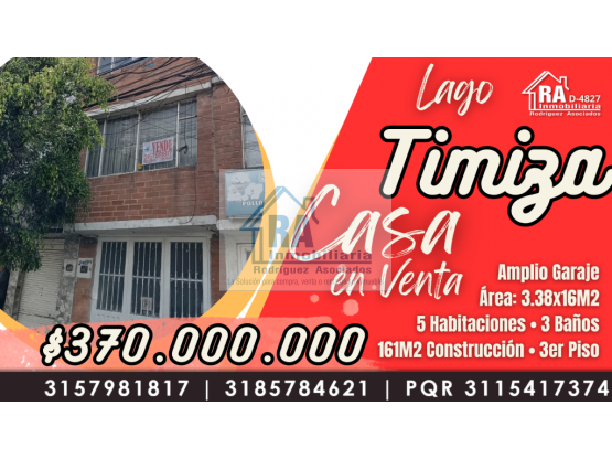 CASA DE TRES NIVELES CON GARAJE, EXCELENTEMENTE SITUADA EN LAGO TIMIZA D-4827 Casa en venta de tres niveles en el barrio lago tamiza, ubicada en un sector residencial tranquilo y seguro, con excelente acceso a transporte público, instituciones educativas, comercio cerca, con un área lote de 3.38m de frente y 16 m de fondo, un área construida de 161m² construidos, distribuidos así: Al ingresar en el primer piso, un garaje, sala, un baño, cocina comedor y zona de lavandería; En el segundo piso tres habitaciones y un baño; en el tercer piso dos habitaciones un baño sala y cocina, con muy buena iluminación natural. ¡Oportunidad para invertir! VALOR: $370.000.000
