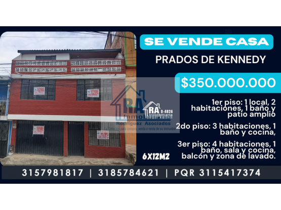 CASA RENTABLE CON LOCAL EN PRADOS DE KENNEDY, EXCELENTEMENTE UBICADA D-4826 Casa en venta de tres niveles en el barrio Prados de Kennedy, ubicada en un sector residencial tranquilo y seguro, con excelente acceso a transporte público, cerca de la av. Primera de mayo, instituciones educativas, comercio cerca, con un área lote de 6 metros de frente y 12 metros de fondo, un área construida de 215m² construidos, distribuidos así: Al ingresar en el primer piso, un local dos habitaciones, un baño y patio amplio, En el segundo piso tres habitaciones y un baño y cocina, en el tercer piso cuatro habitaciones, un baño sala y cocina, balcón y zona de lavado, con muy buena iluminación natural. ¡Oportunidad para invertir! VALOR: $350.000.000