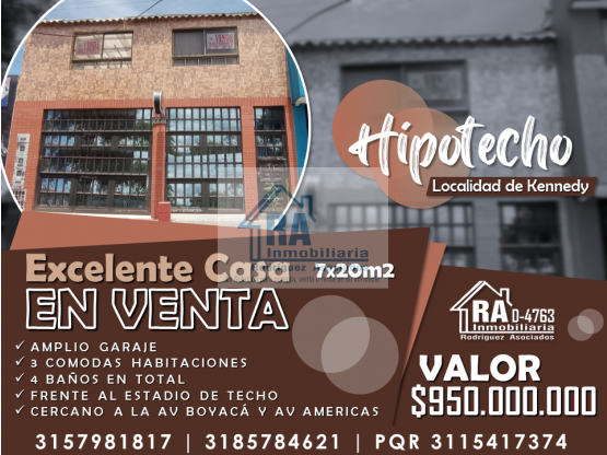 CASA CON GARAJE EN AMERICAS HIPOTECHO FRENTE AL ESTADIO DE TECHO D-4762 Espectacular casa para la venta en el barrio américas hipotecho, esta propiedad de área de lote 7m2 X 20m2 y área construida de 140m2 es ideal tanto para vivienda como para inversión. Estratégicamente ubicada frente al estadio de techo diagonal al parque mundo aventura, a una cuadra de la avenida Boyacá cerca de la avenida de las américas y avenida primera de mayo; a pocos minutos del centro comercial plaza de las américas, clínica de occidente, colegios privados y distritales , además cuenta con excelente acceso al transporte público, este inmueble se distribuye en: local independiente con baño privado, garaje amplio brindando comodidad y seguridad, sala comedor amplia, zona de estar, estudio, dos baños, zona de lavado y cocina moderna y funcional y tres cómodas habitaciones, adicional de tener un aparta estudio independiente con una habitación, 1 baño, cocina y zona de lavado. No pierdas la oportunida