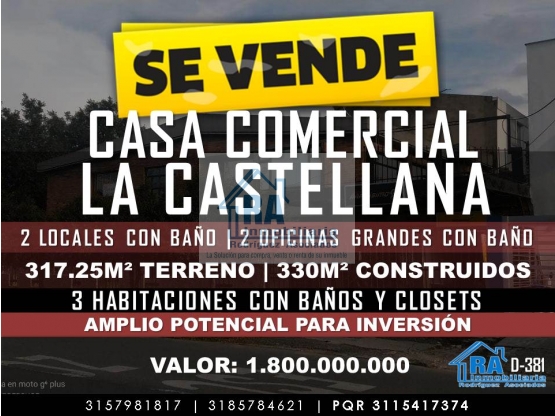 EN VENTA CASA ESQUINERA Y COMERCIAL CON EXCELENTE UBICACIÓN EN BARRIO LA CASTELLANA BOGOTÁ D-381 En venta espectacular casa esquinera con área la lote de 317.25m² y construidos de 330m² en el barrio la castellana, cerca de la autopista Norte con carrera 30, muy cerca de centros médicos; consta de: 1° piso: Dos locales independientes con baño cada local; Dos oficinas grandes •una de ellas con tres cuartos y dos baños; • la otra oficina con tres espacios amplios y un baño. 2° piso: cuenta con tres habitaciones con closet empotrado sala comedor amplia, espacio para cocina, 3 baños además de una terraza amplia. Valor venta: $1800.000.000 INMOBILIARIA R.A “Nacimos para servir” Contáctanos vía WhatsApp: http://wa.me/573185784621 http://wa.me/573157981817 Conoce nuestros inmuebles: WEB PAGE: http://inmobiliariara.domusweb.co/ INSTAGRAM: http://instagram.com/_inmobiliariara