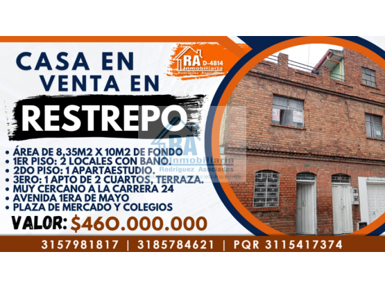 AMPLIA CASA CON LOCALES Y APARTAMENTOS EN RESTREPO D-4814 Cerca de la plaza de mercado, instituciones educativas como el colegio Guillermo León Valencia, el Atanasio Girardot colegio la Balvanera, buen acceso a transporte público y avenidas principales como la carrera 24 y avenida primera de mayo, esta amplia casa tiene un área de frente de 8.35m por 10 m fondo y distribuidos así: primer piso: dos locales comerciales cada uno con baño privado, segundo piso: un apartamento con una habitación, 1 baño, sala comedor, cocina , hall y zona de lavado ; en el tercer piso encontramos un apartamento con dos habitaciones , cocina , 1 baño, y terraza , un lugar ideal para invertir!. $460.000.000