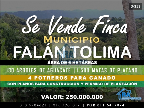 SE VENDE ESPECTACULAR FINCA UBICADA EN EL MUNICIPIO DE FALAN TOLIMA D-353 Con area de 6 hectareas sobre la via principal de mariquita – palocabildo consta de 130 arboles de aguacate, 1.500 matas de platano, 4 potreros para ganado, agua propia de nacimiento, luz, cuenta con planos para construcción y permiso de planeación. Valor: 250.000.000 INMOBILIARIA R.A “Nacimos para servir” Contáctanos vía WhatsApp: http://wa.me/573185784621 http://wa.me/573157981817 Conoce nuestros inmuebles: WEB PAGE: http://inmobiliariara.domusweb.co/ INSTAGRAM: http://instagram.com/_inmobiliariara FACEBOOK: http://facebook.com/InmobiliariaRA TWITTER: http://Twitter.com/_inmobiliariaRA YOUTUBE: https://www.youtube.com/channel/UCAUtWv-Ud9NYe7ZemMMeXAQ?view_as=subscriber UBÍCANOS: https://g.page/INMOBILIARIARA NUESTRA EMPRESA: http://INMOBILIARIARA.NEGOCIO.SITE INMOBILIARIA R.A “nacimos para servir” CONTÁCTENOS... http://inmobiliariara.domusweb.co Celular: +57 3185784621-3157981817 PQR 3115417374 Teléfono: +57 (1) 5649646 mail: inmobiliariariarodriguez.a@gmail.com Dirección: Carrera 71 D # 2 B - 13 Bogotá (Colombia)