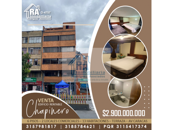 EDIFICIO AMPLIAMENTE RENTABLE CON 13 HABITACIONES EN CHAPINERO, AV CARACAS D-4757 Aprovecha la oportunidad de invertir en este grandioso edificio de 11 X 7 M² ubicado en Chapinero Occidental, un sector altamente comercial. Sobre la Avenida Caracas y frente a la estación de Transmilenio, te brinda fácil acceso al transporte público y a diversas necesidades diarias. A solo unas cuadras, encontrarás la plaza de Lourdes, supermercados como éxito, Olímpica, D1, Ara y Dollar City, asegurando que todo lo que necesitas esté a tu alcance. Este encantador inmueble cuenta con seis pisos, cada uno con una distribución funcional y acogedora. En el primer piso, encontrarás dos amplios locales comerciales. El segundo piso alberga una habitación con closet, un cuarto de lavado y una cocina. En los pisos: tercero, cuarto y quinto, encontraras tres habitaciones por piso, cada una con baño privado. Finalmente, en el sexto piso, encontrarás tres habitaciones, también con baño, y una terraza con