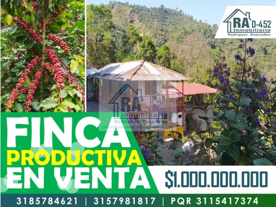 SE VENDE ESPECTACULAR FINCA CAFETERA EN BETANIA, ANTIOQUIA D-452 Se vende espectacular finca cafetera en Betania Antioquia (a solo 8 km del casco urbano). Ubicada en la Vereda Media Luna (a solo 5 minutos de la escuela rural. Esta bella finca tiene 20 cuadras, igual a 12.8 hectáreas. Con Fuentes hídricas basadas en aguas de nacimiento y acueducto, con Topografía ondulada y una Infraestructura de 2 casas, beneficio de última generación, 2 marquesinas, 3 secadoras solares tipo Casillas y galpón para 100 cerdos. Entre las Maquinaria y equipos tenemos: Despulpadora, desmucilaginadora, moto bomba de 1.5 HP, secadora automática de doscientas arrobas, estacionarias, básculas digitales y amplio inventario de herramientas, accesorios y repuestos. Entre los Cultivos tenemos: 1350 plantas de plátano en monocultivo 800 plantas asociadas con café En Café tenemos: 7000 árboles de (48 meses de edad) 25000 árboles de (36 meses de edad) 15000 árboles de (24 meses) 5000 árboles de (15 meses) 17000 árboles de (4 meses) Manejando un TOTAL de 69000 árboles. (75% de la finca tiene cultivos nuevos y en plena producción) Esta productiva finca tiene un excelente Valor de 1.000.000.000 de pesos INMOBILIARIA R.A “Nacimos para servir” Contáctanos vía WhatsApp: http://wa.me/573185784621 http://wa.me/573157981817 Conoce nuestros inmuebles: WEB PAGE: http://inmobiliariara.domusweb.co/ INSTAGRAM: http://instagram.com/_inmobiliariara FACEBOOK: http://facebook.com/InmobiliariaRA TWITTER: http://Twitter.com/_inmobiliariaRA YOUTUBE: https://www.youtube.com/channel/UCAUtWv-Ud9NYe7ZemMMeXAQ?view_as=subscriber UBÍCANOS: https://g.page/INMOBILIARIARA NUESTRA EMPRESA: http://INMOBILIARIARA.NEGOCIO.SITE INMOBILIARIA R.A “nacimos para servir” CONTÁCTENOS... http://inmobiliariara.domusweb.co Celular: +57 3185784621-3157981817 PQR 3115417374 Teléfono: +57 (1) 5649646 mail: inmobiliariariarodriguez.a@gmail.com Dirección: Carrera 71 D # 2 B - 13 Bogotá (Colombia)