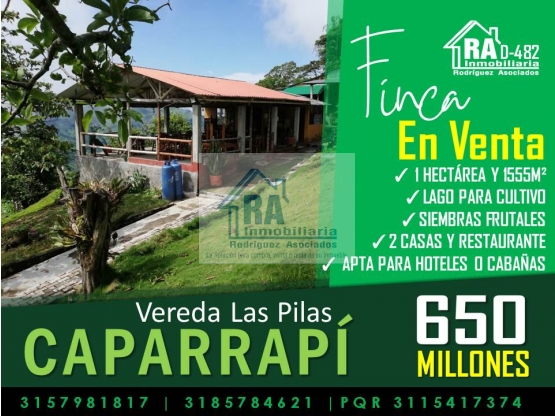 SE VENDE FINCA CON DOS CASAS Y GRAN POTENCIAL PARA PROYECTO TURISTICO EN CAPARRAPI D-482 Maravillosa finca semiurbana (salida a Utica) para la venta en caparrapi vereda las pilas sitio la unión, situada a 500m del batallón del ejército con un área de terreno de 1 hectárea y 1555m² cultivada en aguacate de diferentes variedades además de tener un lago para cultivo de peces. Cuenta con dos casas amplias cada una con sala comedor cocina tres habitaciones y baño construcción moderna; un restaurante apto para cien personas en funcionamiento. Además tiene con luz trifásica acueducto urbano y vereda. es una finca apta para cabañas, hotel campestre y/o proyecto eco –turístico. Muy buenas vías de acceso y queda a 5 minutos de la plaza central del pueblo. Valor de $650.000.000 INMOBILIARIA R.A “Nacimos para servir” Contáctanos vía WhatsApp: http://wa.me/573185784621 http://wa.me/573157981817 Conoce nuestros inmuebles: WEB PAGE: http://inmobiliariara.domusweb.co/