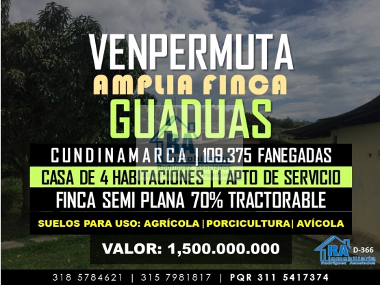 VENPERMUTA DE AMPLIA FINCA EN GUADUAS CUNDINAMARCA D-366 Se vende o permuta finca ubicada en el municipio de guaduas Cundinamarca de 109.375 fanegadas con casa de 4 habitaciones, cocina. Baño y sala comedor, aparte apartamento para cuidador. Cuenta con corrales, ordeño mecánico, buenas aguas, la finca queda a bordo de la carretera finca semi plana 70% tractorable, uso de suelos apto para agrícola, porcicultura, avícola… se permuta por un apartamento bien ubicado en el norte de bogota. La finca queda a 20 minutos del casco urbano de guaduas via guaduas-chaguani Valor: 1.500.000.000 INMOBILIARIA R.A “Nacimos para servir” Contáctanos vía WhatsApp: http://wa.me/573185784621 http://wa.me/573157981817 Conoce nuestros inmuebles: WEB PAGE: http://inmobiliariara.domusweb.co/ INSTAGRAM: http://instagram.com/_inmobiliariara FACEBOOK: http://facebook.com/InmobiliariaRA TWITTER: http://Twitter.com/_inmobiliariaRA YOUTUBE: https://www.youtube.com/channel/UCAUtWv-Ud9NYe7ZemMMeXAQ?view_as=subscriber UBÍCANOS: https://g.page/INMOBILIARIARA NUESTRA EMPRESA: http://INMOBILIARIARA.NEGOCIO.SITE INMOBILIARIA R.A “nacimos para servir” CONTÁCTENOS... http://inmobiliariara.domusweb.co Celular: +57 3185784621-3157981817 PQR 3115417374 Teléfono: +57 (1) 5649646 mail: inmobiliariariarodriguez.a@gmail.com Dirección: Carrera 71 D # 2 B - 13 Bogotá (Colombia)