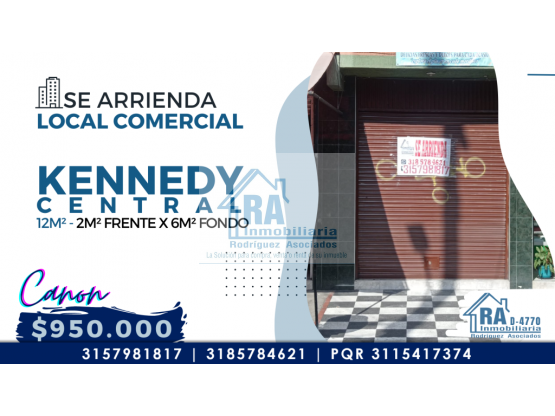ESPECTACULAR LOCAL EN ARRIENDO SITUADO EN EL BARRIO KENNEDY CENTRAL D-4770 Se beneficia de una excelente visibilidad y alto tráfico peatonal, ideal para atraer a una amplia clientela. Con un área de 12 m². (2 de frente por 6 de fondo) distribuidos en un área abierta que permite una fácil adaptación a diferentes tipos de negocios. Cuenta con baño privado, Entrada independiente, con acceso fácil desde la calle principal, lo que facilita la llegada de clientes con servicios de agua y luz. Este local es perfecto y te permitirá personalizarlo según las necesidades específicas de tu emprendimiento. Valor: $950.000 INMOBILIARIA R.A “Nacimos para servir” Contáctanos vía WhatsApp: http://wa.me/573185784621 http://wa.me/573157981817 Conoce nuestros inmuebles: WEB PAGE: http://inmobiliariara.domusweb.co/ INSTAGRAM: http://instagram.com/_inmobiliariara FACEBOOK: http://facebook.com/InmobiliariaRA TWITTER: http://Twitter.com/_inmobiliariaRA YOUTUBE: https://www.youtube.com/channel/UCAUtWv-Ud9N