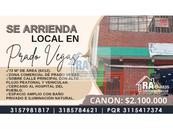 Local comercial de 72 m² (6x12) en segundo piso, ubicado en la zona comercial de Prado Vegas, Soacha, sobre la calle principal. Cuenta con excelente iluminación natural y baño privado. Su cercanía al Hospital del Pueblo y a nuevos proyectos de apartamentos garantiza alto flujo peatonal y vehicular. Ideal para oficinas, consultorios, gimnasios o centros de capacitación.