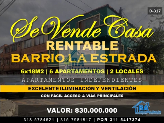SE VENDE ESPECTACULAR CASA RENTABLE ESQUINERA EN EL BARRIO LA ESTRADA D-317 Se vende gran casa esquinera de 6 x 18 que consta de: 1er piso. Apto con entrada independiente de 2 habitaciones grandes, sala comedor amplia, cocina, baño y patio de ropas, otro apto con entrada independiente, local grande y aparte un local pequeño con una habitación cocina y baño 2do piso, entrada independiente, 4 apartamentos independientes de 3 habitaciones, baño, cocina, sala y patio, la casa cuenta con excelente iluminación y ventilación La casa queda cerca de la av. rojas, con acceso rápido a zonas bancarias, cerca de supermercado d1, colegio francisco José de caldas sede b y a muy pocas cuadras de calles de comercio VALOR: 830.000.000 INMOBILIARIA R.A “Nacimos para servir” Contáctanos vía WhatsApp: http://wa.me/573185784621 http://wa.me/573157981817 Conoce nuestros inmuebles: WEB PAGE: http://inmobiliariara.domusweb.co/ INSTAGRAM: http://instagram.com/_inmobiliariara FACEBOOK: http://facebook.com/InmobiliariaRA TWITTER: http://Twitter.com/_inmobiliariaRA YOUTUBE: https://www.youtube.com/channel/UCAUtWv-Ud9NYe7ZemMMeXAQ?view_as=subscriber UBÍCANOS: https://g.page/INMOBILIARIARA NUESTRA EMPRESA: http://INMOBILIARIARA.NEGOCIO.SITE INMOBILIARIA R.A “nacimos para servir” CONTÁCTENOS... http://inmobiliariara.domusweb.co Celular: +57 3185784621-3157981817 PQR 3115417374 Teléfono: +57 (1) 5649646 mail: inmobiliariariarodriguez.a@gmail.com Dirección: Carrera 71 D # 2 B - 13 Bogotá (Colombia)