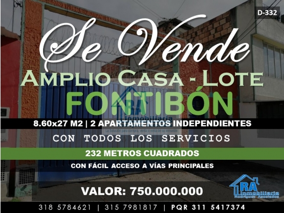 SE VENDE AMPLIO CASA-LOTE CON POTENCIAL PARA CONSTRUCCIÓN EN FONTIBÓN D-332 Inmueble de 8.60x27 232 metros cuadrados ideal para construcción que consta de: a la entrada encontramos espacio abierto amplio, 2 habitaciones amplias, 1 cocina, zona de lavado y baño y un apto independiente de 2 habitaciones amplias, cocina, baño y sala comedor amplia, el apartamento esta enchapado en su totalidad con techo de PVC, el casa-lote cuenta con todos los servicios públicos Queda ubicado a pocas cuadras de liceo María Goretti, a 3 cuadras de la av. calle 22, a su alrededor encontramos todo tipo de comercio Valor: 750.000.000 INMOBILIARIA R.A “Nacimos para servir” Contáctanos vía WhatsApp: http://wa.me/573185784621 http://wa.me/573157981817 Conoce nuestros inmuebles: WEB PAGE: http://inmobiliariara.domusweb.co/ INSTAGRAM: http://instagram.com/_inmobiliariara FACEBOOK: http://facebook.com/InmobiliariaRA TWITTER: http://Twitter.com/_inmobiliariaRA YOUTUBE: https://www.youtube.com/channel/UCAUtWv-Ud9NYe7ZemMMeXAQ?view_as=subscriber UBÍCANOS: https://g.page/INMOBILIARIARA NUESTRA EMPRESA: http://INMOBILIARIARA.NEGOCIO.SITE INMOBILIARIA R.A “nacimos para servir” CONTÁCTENOS... http://inmobiliariara.domusweb.co Celular: +57 3185784621-3157981817 PQR 3115417374 Teléfono: +57 (1) 5649646 mail: inmobiliariariarodriguez.a@gmail.com Dirección: Carrera 71 D # 2 B - 13 Bogotá (Colombia)