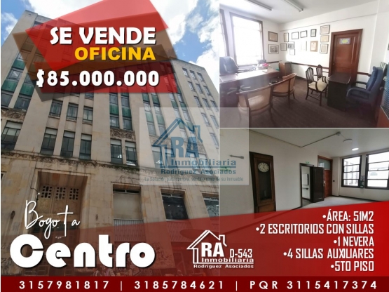 ESPECTACULAR OFICINA AMOBLADA PARA LA VENTA EN EL CENTRO DE BOGOTÁ D-543 Espectacular oficina Amoblada para la venta en el centro de Bogotá, con una excelente ubicación, cerca de la estación de Transmilenio MUSEO DEL ORO, con un área de 51 m², cuenta con buena iluminación , situada en un quinto piso con ascensor, el edificio cuenta con baño comunal por piso, vigilancia 24/7. La oficina se entrega con dos escritorios en madera, 2 sillas en cuero, una nevera pequeña, 4 sillas auxiliarles, 1 paragüero, una mesa de centro y persianas. Valor venta: $85.000.000 Administración: $ 140. 000 INMOBILIARIA R.A “Nacimos para servir” Contáctanos vía WhatsApp: http://wa.me/573185784621 http://wa.me/573157981817 Conoce nuestros inmuebles: WEB PAGE: http://inmobiliariara.domusweb.co/ INSTAGRAM: http://instagram.com/_inmobiliariara FACEBOOK: http://facebook.com/InmobiliariaRA TWITTER: http://Twitter.com/_inmobiliariaRA YOUTUBE: https://www.youtube.com/channel/UCAUtWv-Ud9NYe7ZemMMeXAQ